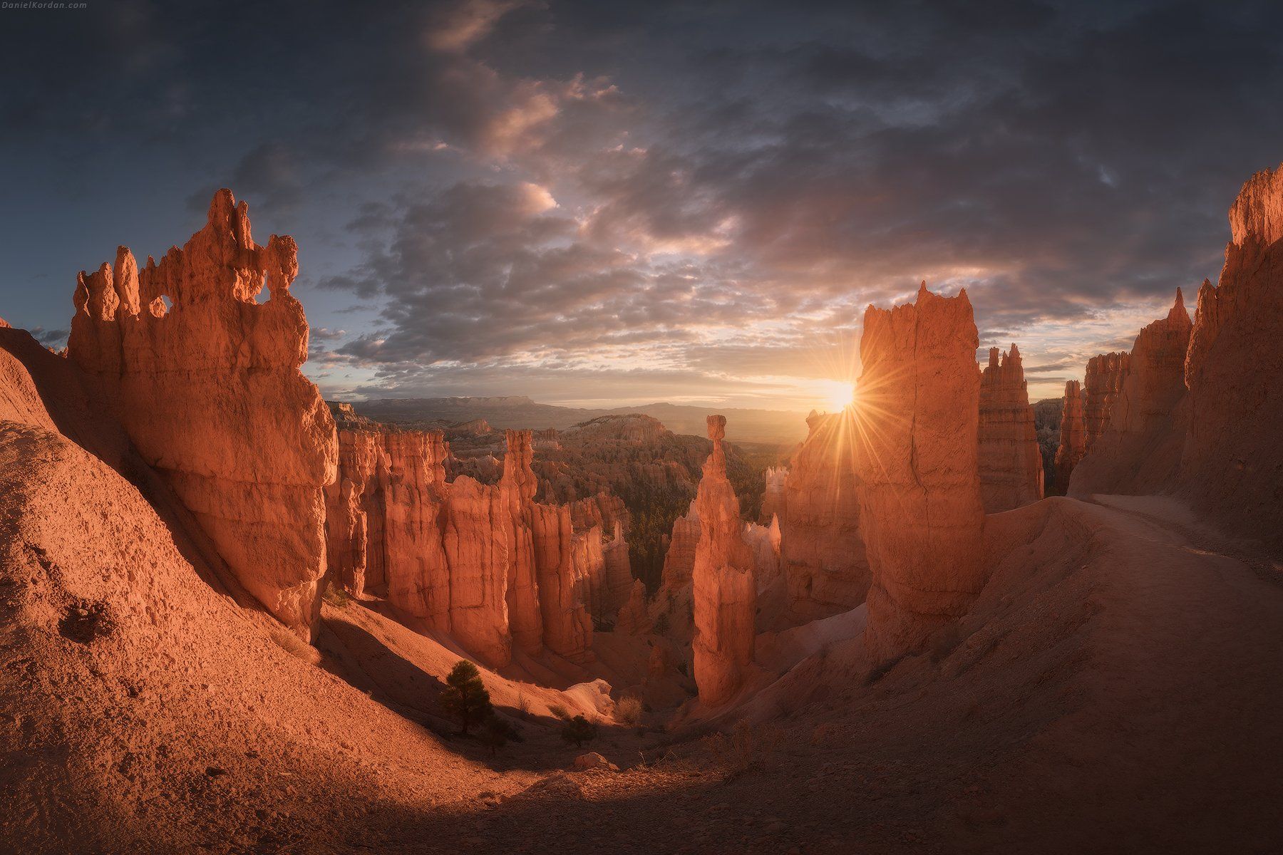 В каньоне Брайс, где время замедлилось, солнце скрывается за вершинами, оставляя после себя огненные блики на гранях хрупких башен. Каждая скала — как скульптура, вырезанная ветром и временем. Тишина, пронизанная теплым светом, заставляет задуматься о величии природы. Фотограф Даниил Коржонов запечатлел миг, когда земля и небо сливаются в едином дыхании.