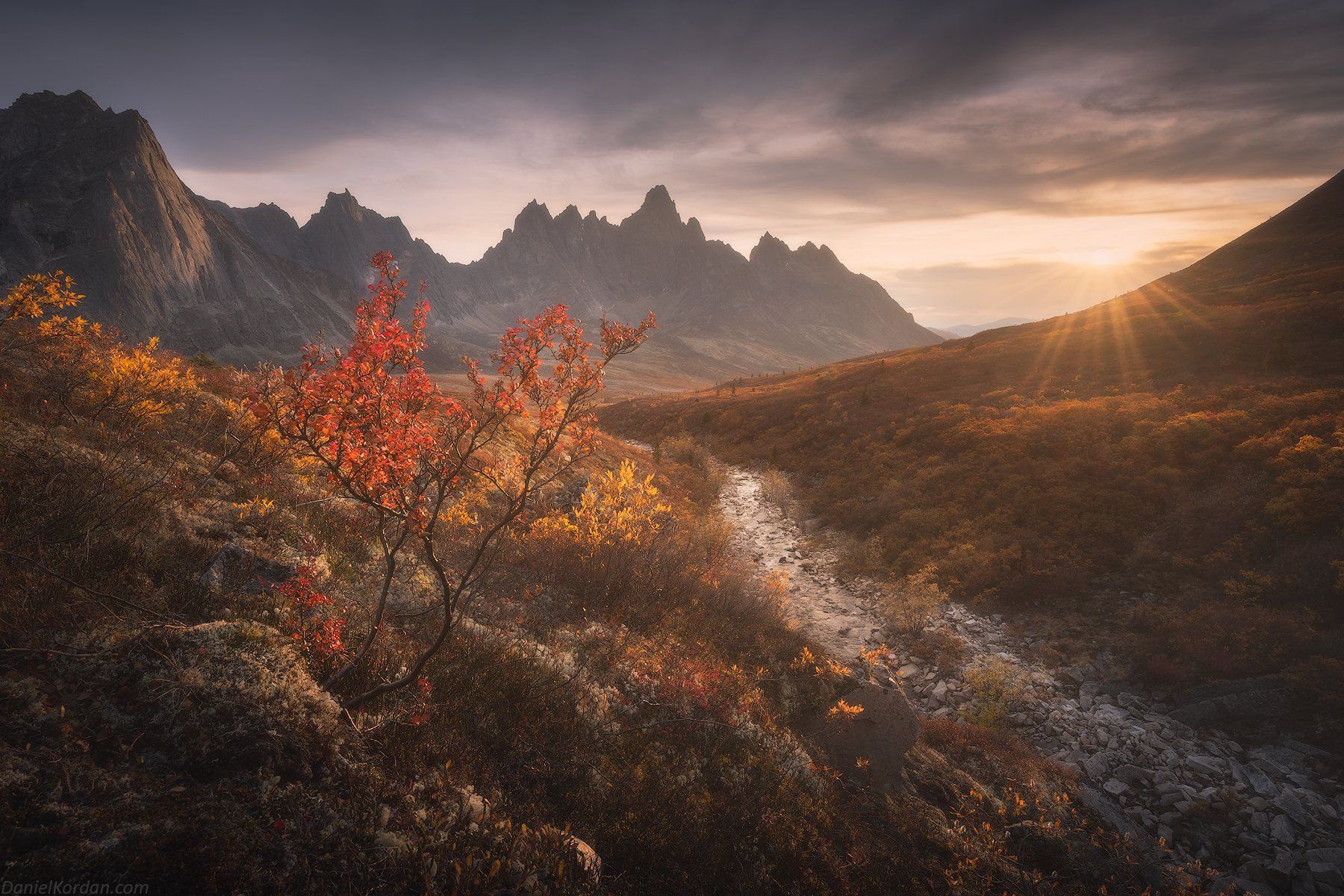 На снимке — драматический пейзаж горного хребта в районе Yukon. Осень окрашивает растительность в насыщенные красные и оранжевые тона, а солнце, скрывающееся за вершинами, создаёт эффект бликов и контрастных теней. Река в долине отражает свет, усиливая ощущение глубины. Композиция передаёт одновременно величие природы и умиротворение. Фотография отражает гармонию света, тени и ландшафта в момент перехода дня в вечер.