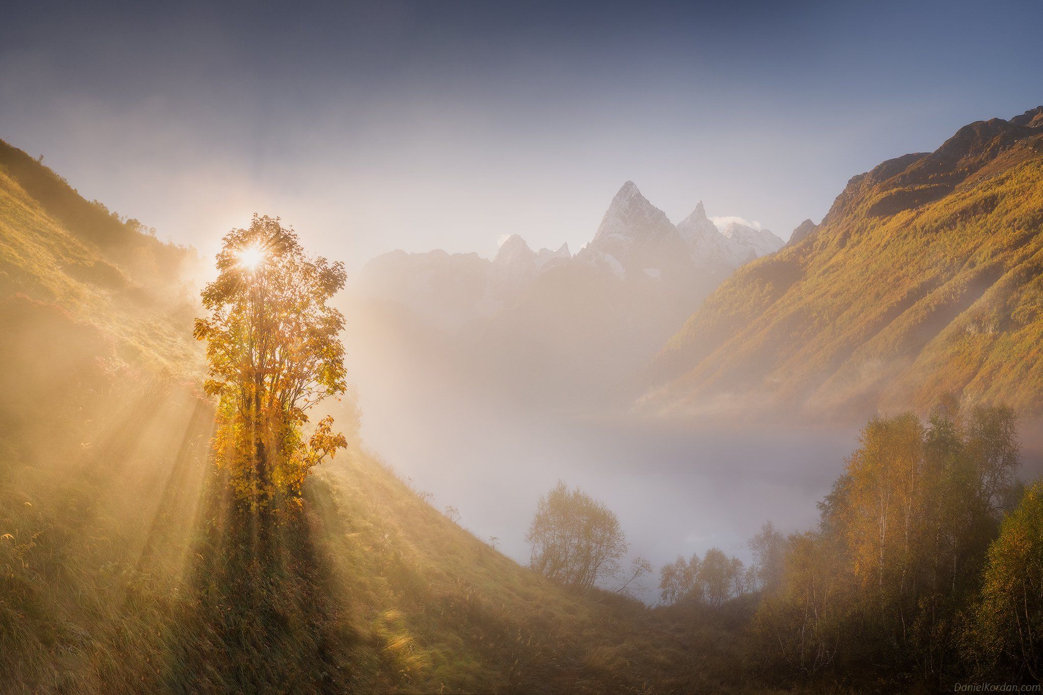 На рассвете в долине Туманлы-Кель солнце пробивается сквозь плотный туман, создавая эффект божественного сияния. Одинокое дерево на склоне становится центром композиции, подчеркивая масштаб и гармонию горного ландшафта. Вдали — острые пики Кавказа, окутанные дымкой. Фотограф Даниил Коржонов запечатлел мгновение, когда природа раскрывается во всей своей первозданной красоте.