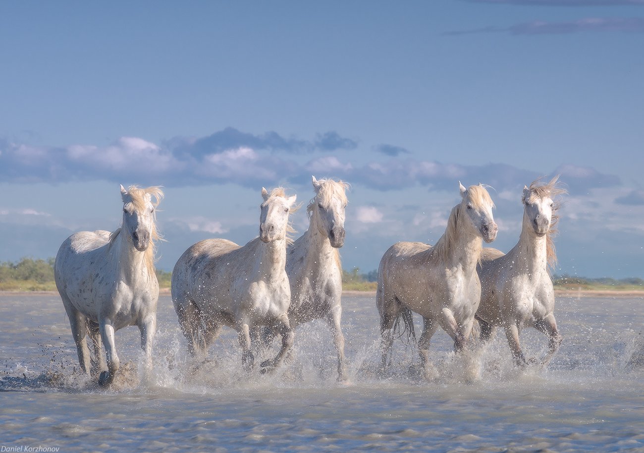 Утром фотографировали белых лошадей в парке Камарг. Удивительные моменты - когда горячие кони несутся по бескрайней глади воды, иногда буквально взлетая над ней, и проносятся мимо нас на сушу.