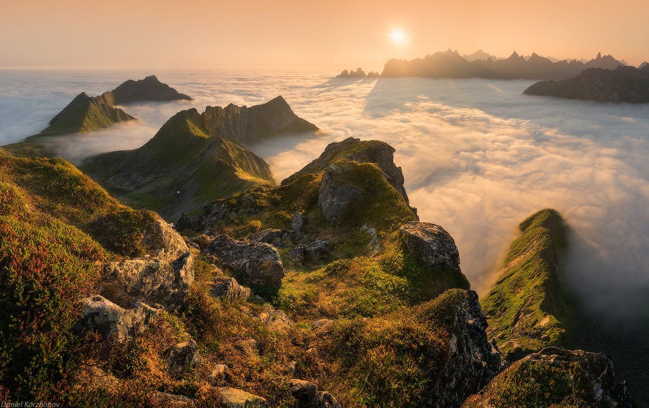 Ночью бегали на уже знакомый вам Husfjellet. 6 часов, 700 метров высоты и вот оно - счастье: заполярное солнце над волнами облаков. А пока - валюсь без ног, нужно поспать и отправиться на новую вершину Сени!