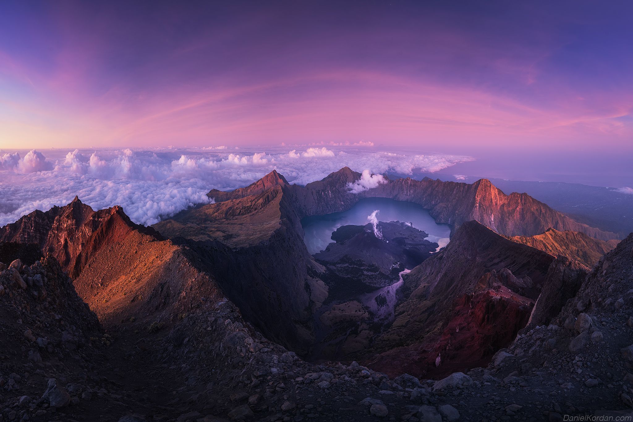 На вершине вулкана Ринджани, в сердце Ломбока, рассвет озаряет кратер, превращая его в космический ландшафт. Фиолетовые оттенки неба контрастируют с тёмными скалами, а внизу — зеркальное озеро, отражающее первые лучи. Облака, как море, окутывают подножие, создавая ощущение возвышенности и одиночества. Фотограф Даниил Коржонов запечатлел этот момент, где природа демонстрирует свою первозданную мощь и красоту.
