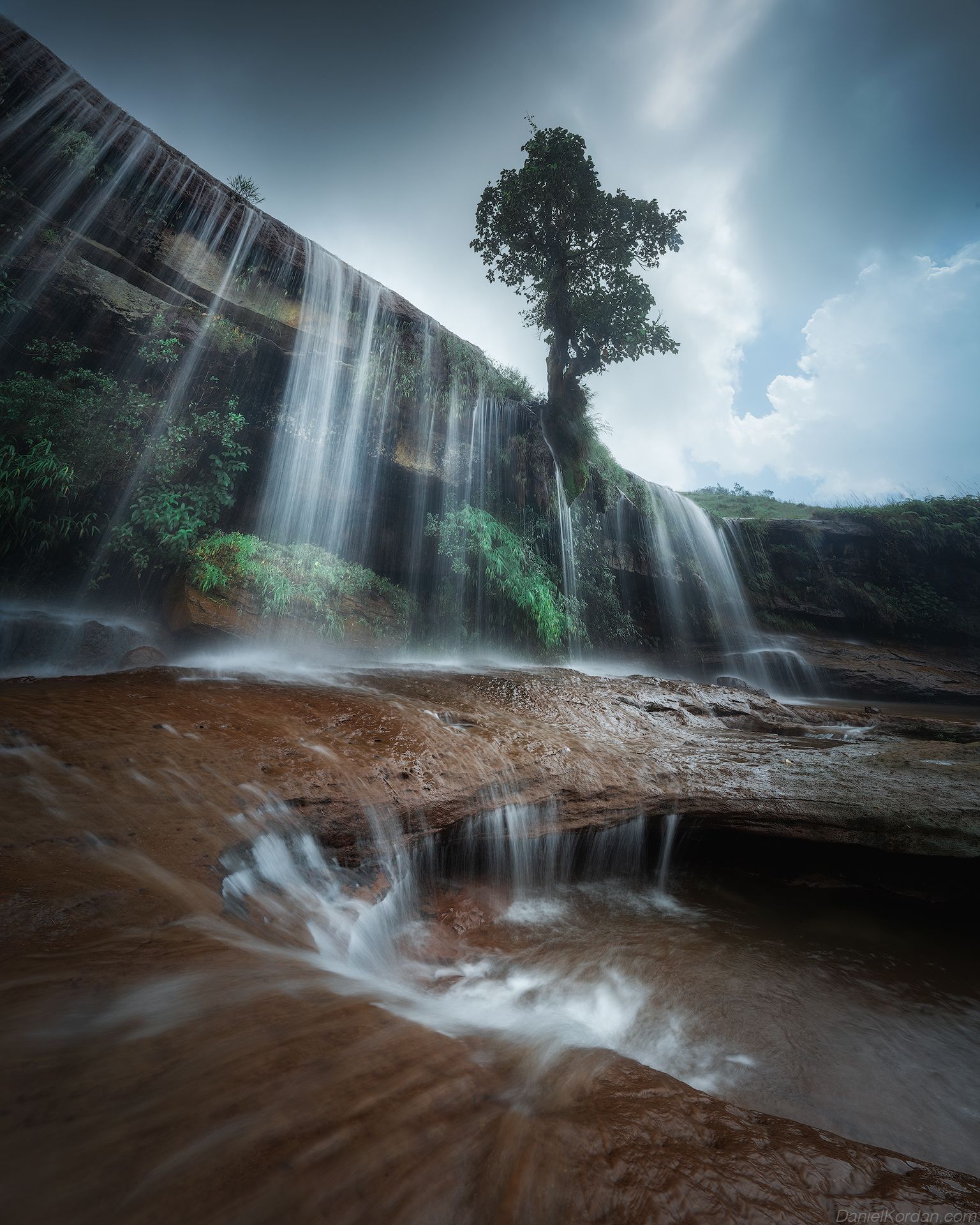 Водопад в Мегхалее, одном из самых влажных мест на Земле, падает по гранитному уступу, образуя тонкие струи, размывающие красноватый камень. На фоне тёмных облаков, прорезанных светом, выделяется одинокое дерево — символ устойчивости в дикой природе. Долгая выдержка передаёт плавность потока, в то время как мокрые скалы и зелёные заросли подчёркивают влажный климат. Фотография Даниила Коржонова запечатлела мгновение, где вода, камень и небо сливаются в единую драматическую композицию.