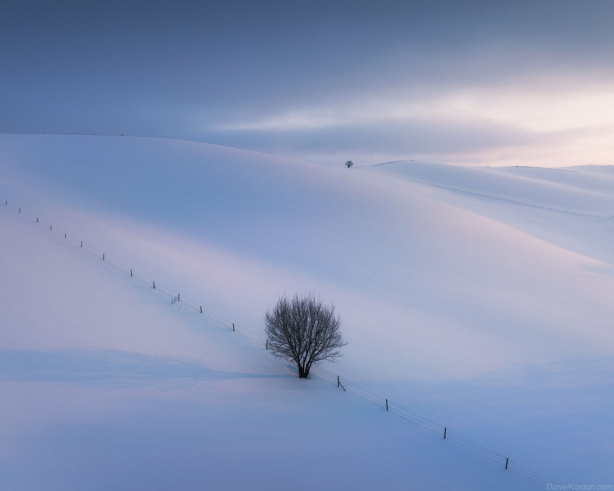 На снимке — снежный склон в Хоккайдо, Япония, где одно дерево выделяется на фоне бескрайнего белого пространства. Тонкая линия забора, уходящая вдаль, создаёт ощущение глубины и изолированности. Свет неба мягко окрашивает снег, подчёркивая чистоту и спокойствие зимнего ландшафта. Фотограф Даниил Коржонов запечатлел момент, в котором природа предстаёт в своей простой, но мощной красоте.