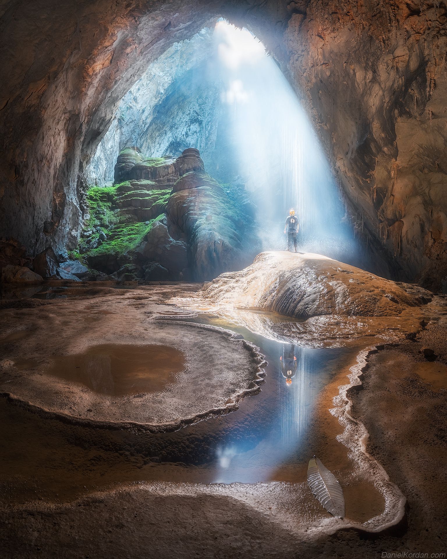 Внутри пещеры Сон Донг, самой большой в мире, свет проникает сквозь естественный свод, создавая драматическую атмосферу. Человек, стоящий на камне, кажется крошечным перед масштабом природы. Вода внизу отражает лучи, усиливая ощущение величия и уединения. Это место — свидетельство мощи и красоты земных процессов.