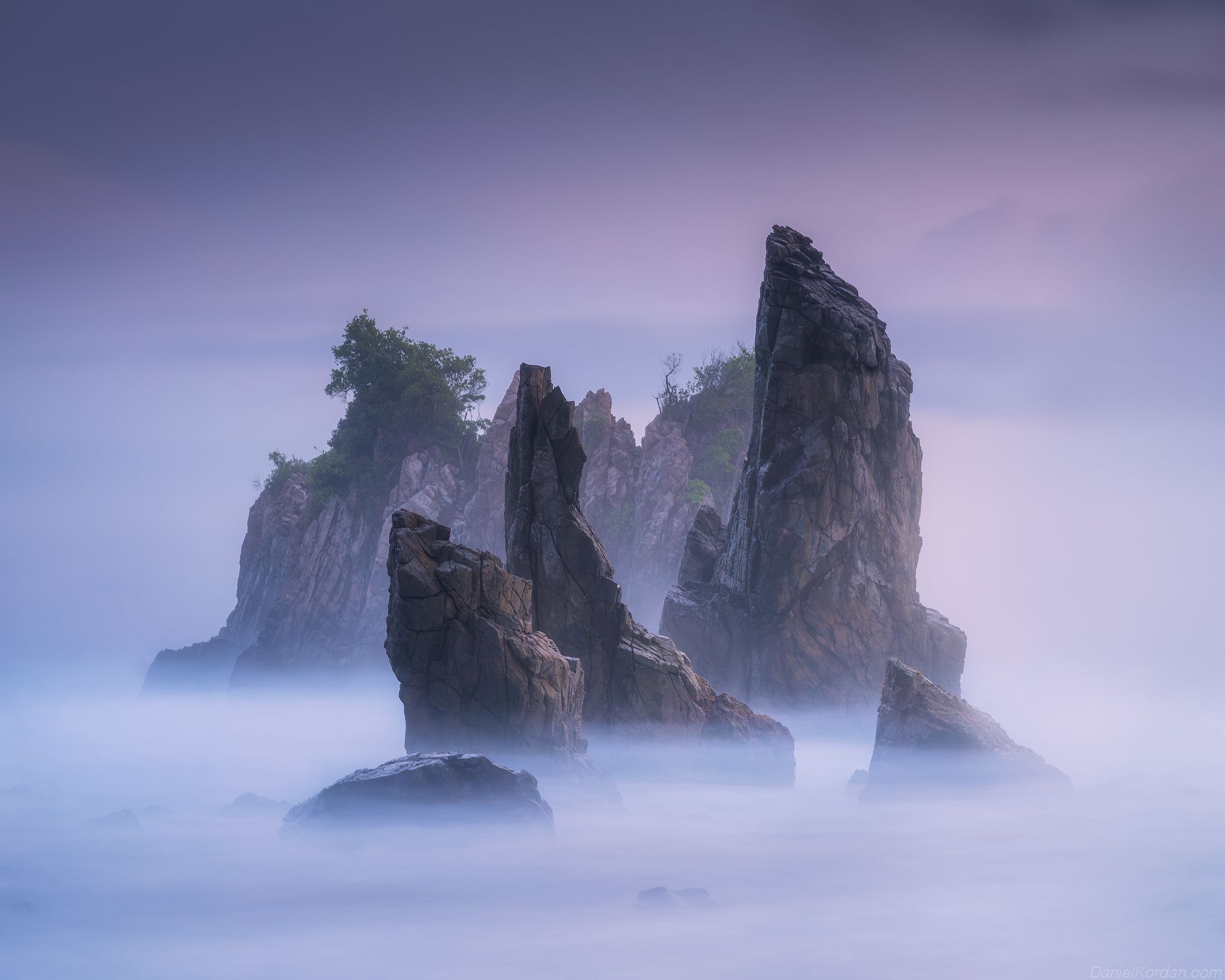 Фотография Даниила Коржонова запечатлела мгновение, когда туман окутывает островные скалы, превращая пейзаж в сказочную сцену. Свет рассвета окрашивает небо в нежные фиолетовые и синие тона, создавая ощущение тишины и уединения. Вода, как стекло, отражает силуэты скал, усиливая визуальную глубину. Это — типичный образ индонезийского побережья, где природа проявляет свою первозданную красоту.