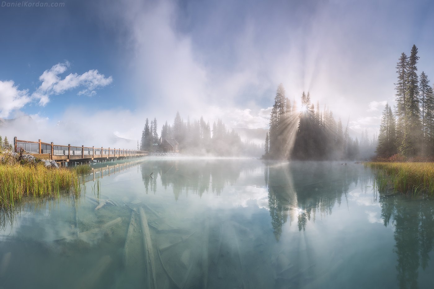 Весь вечер напролёт мы мокли под ливнем на озере Emerald. А на утро у нас даже не было сомнений, что за терпение природа нас чем-нибудь да наградит. И правда, приехав в ночь на озеро, мы были очарованы красотой утра: туман стелился по глади воды, а свет солнца лучами пронизывал высокие деревья. Под их лучами "изумруд" стал полыхать и переливаться.