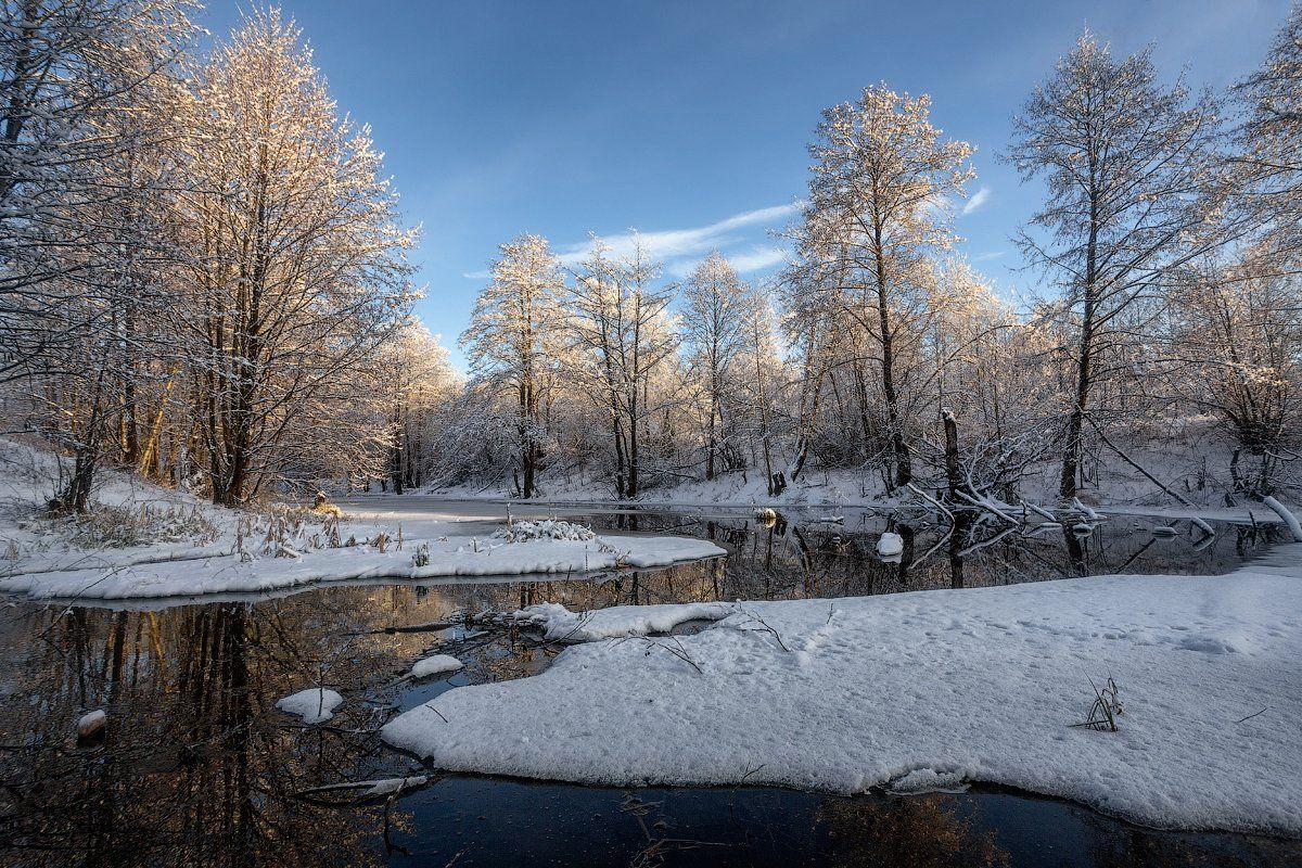 зима природа утро солнце деревья снег река вода настроение берег, Михаил Корнилов