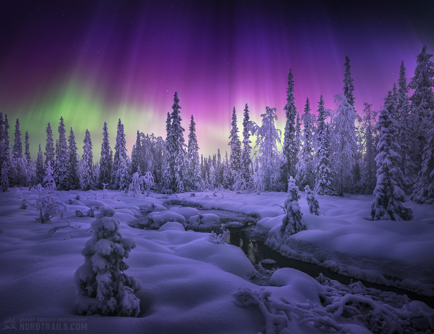 Сергей, это просто впечатляет — как будто сияние в небе и снег на земле договорились быть по-настоящему волшебными. Особенно нравится, как свет проникает сквозь деревья, и речка, будто спрятанная под снегом, добавляет живости.