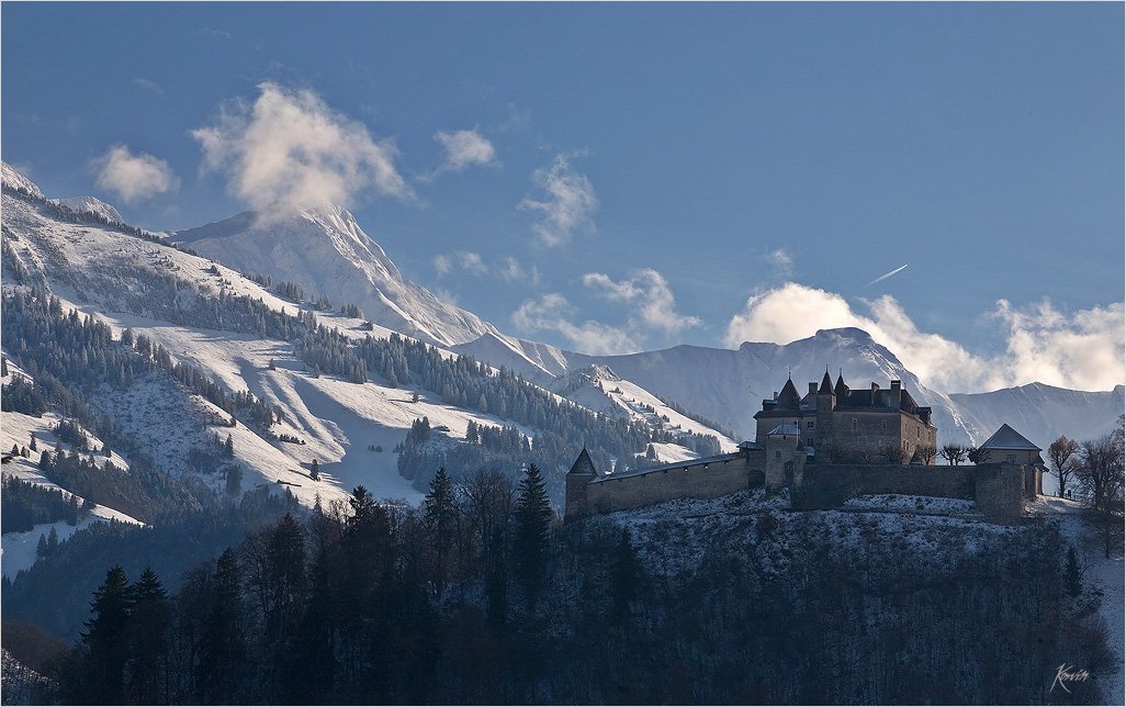 Средневековая деревня стоит на вершине холма у подножья старинного замка ХI в. Ее название произошло от журавля - эта птица украшала герб графа Грюйера Рудольфа III, который и начал строительство замка. Переступая границу замка, Вы словно попадаете в другое время. Внутренний двор окружен постройками и стенами ХIIв. Убранство интерьеров сочетает разные стили: от простоты феодальной эпохи до излишеств XVIII в. Многие декоры выполнены династий художников Бови. Они, кстати, спасли замок от разрушения в прошлом веке, пригласив погостить своих многочисленных друзей из аристократической элиты.