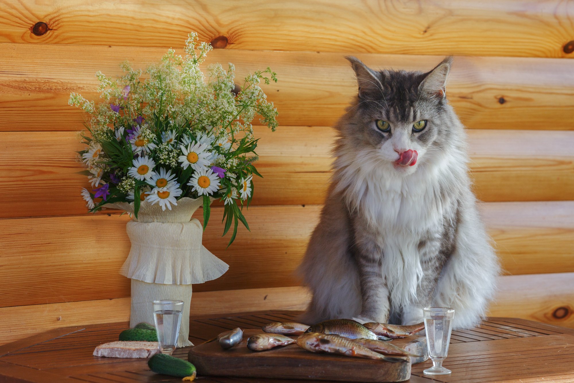 Это особенность породы - свирепый взгляд. Хотя я выбирала котенка самого мультяшного с розовым носом и белой мордочкой, взгляд хищный. Да и карасики перед носом!