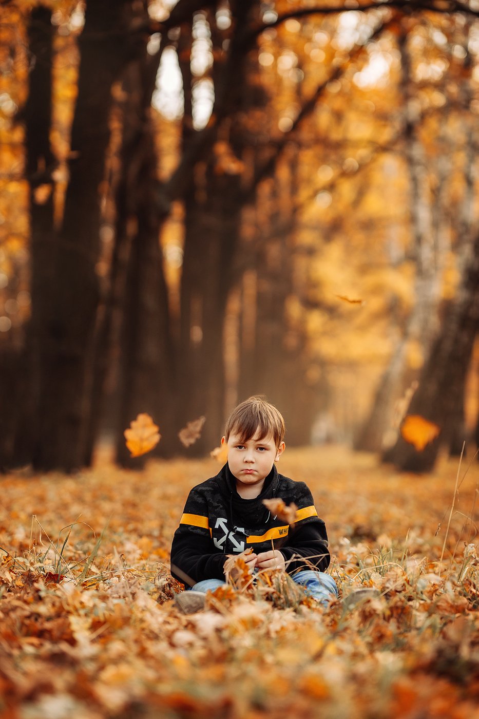 мальчик, ребенок, грусть, печаль, осень, оранжевый, желтый, парк, перспектива, листья, дуб, Ангелина Косова
