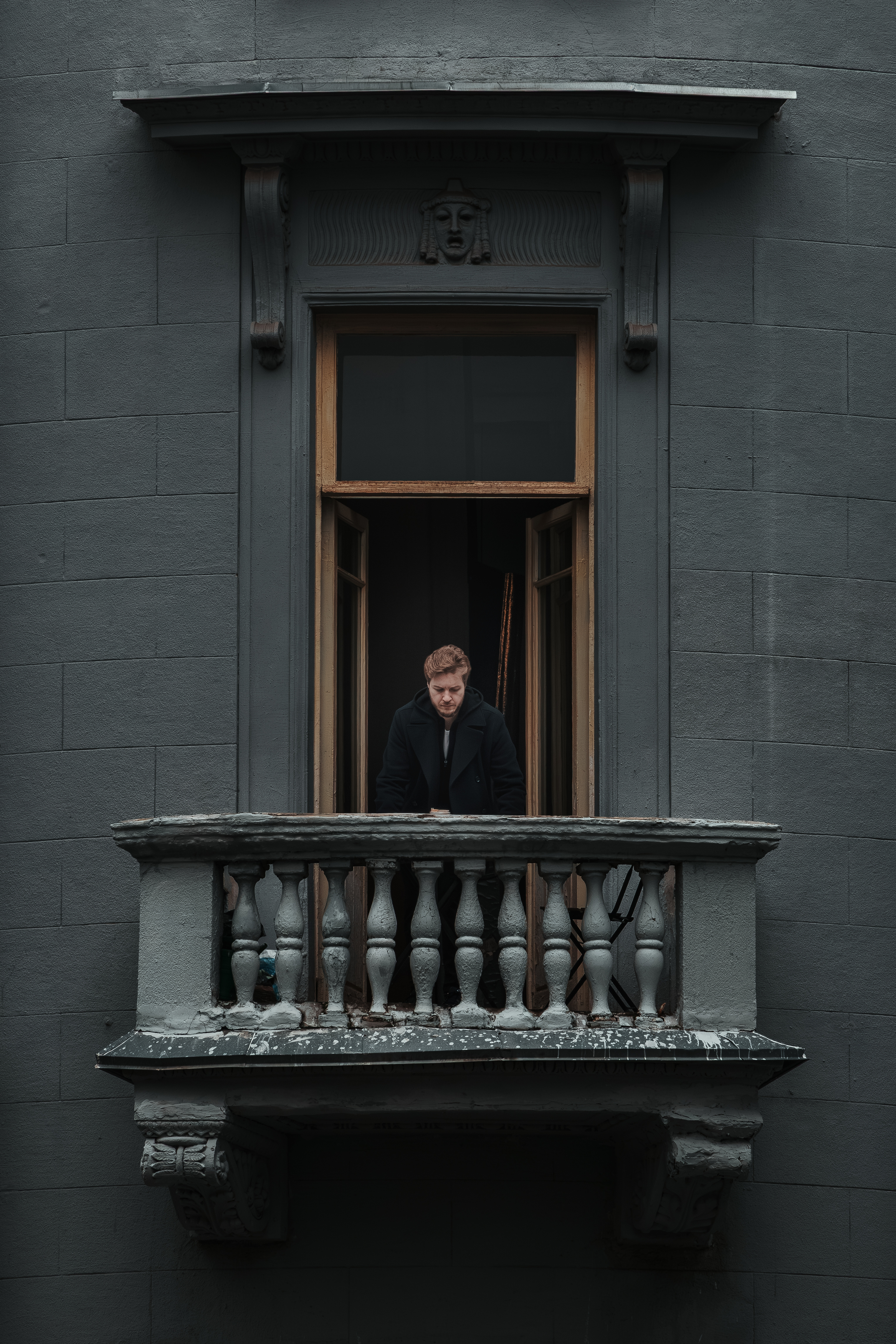 Снимок — как будто вырезан из повседневности, но с той самой тонкой нотой, которую Владимир умеет ловить. Свет в окне, тень на стене, человек в проёме — всё выстроено просто, но с умом. Балкон с его балюстрадами — почти как рамка, а взгляд человека — не на камеру, а вниз, будто он что-то вспоминает или просто смотрит, как день заканчивается.