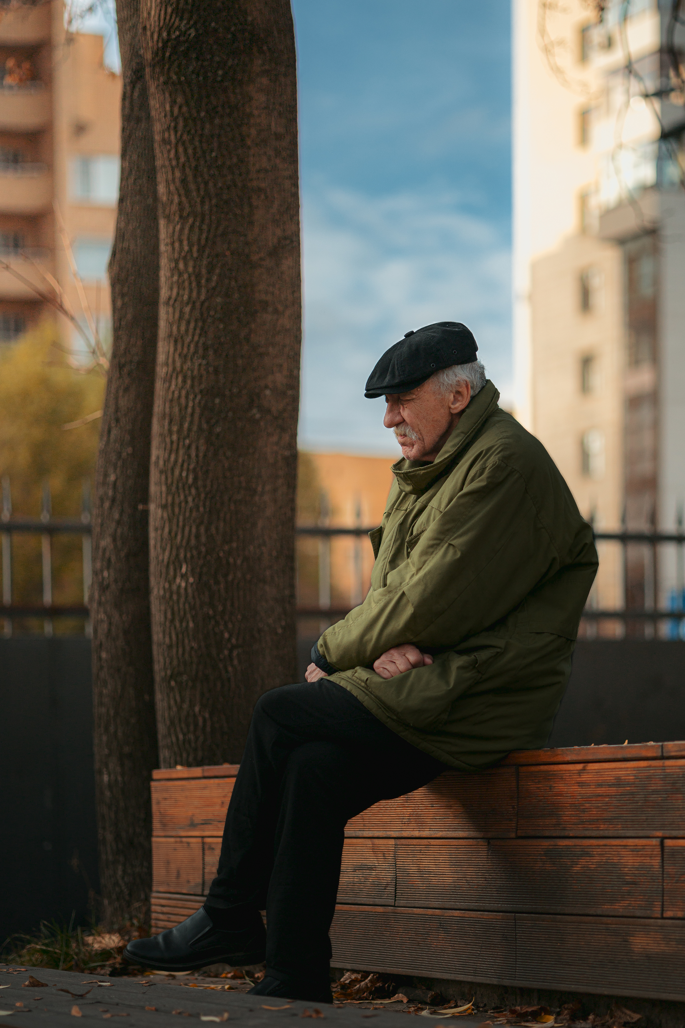 Дерево рядом с человеком — не просто фон. Оно как опора, но и как граница. Старик сидит, не смотрит в камеру, и это правильное решение. Взгляд ушёл — и это создаёт пространство.