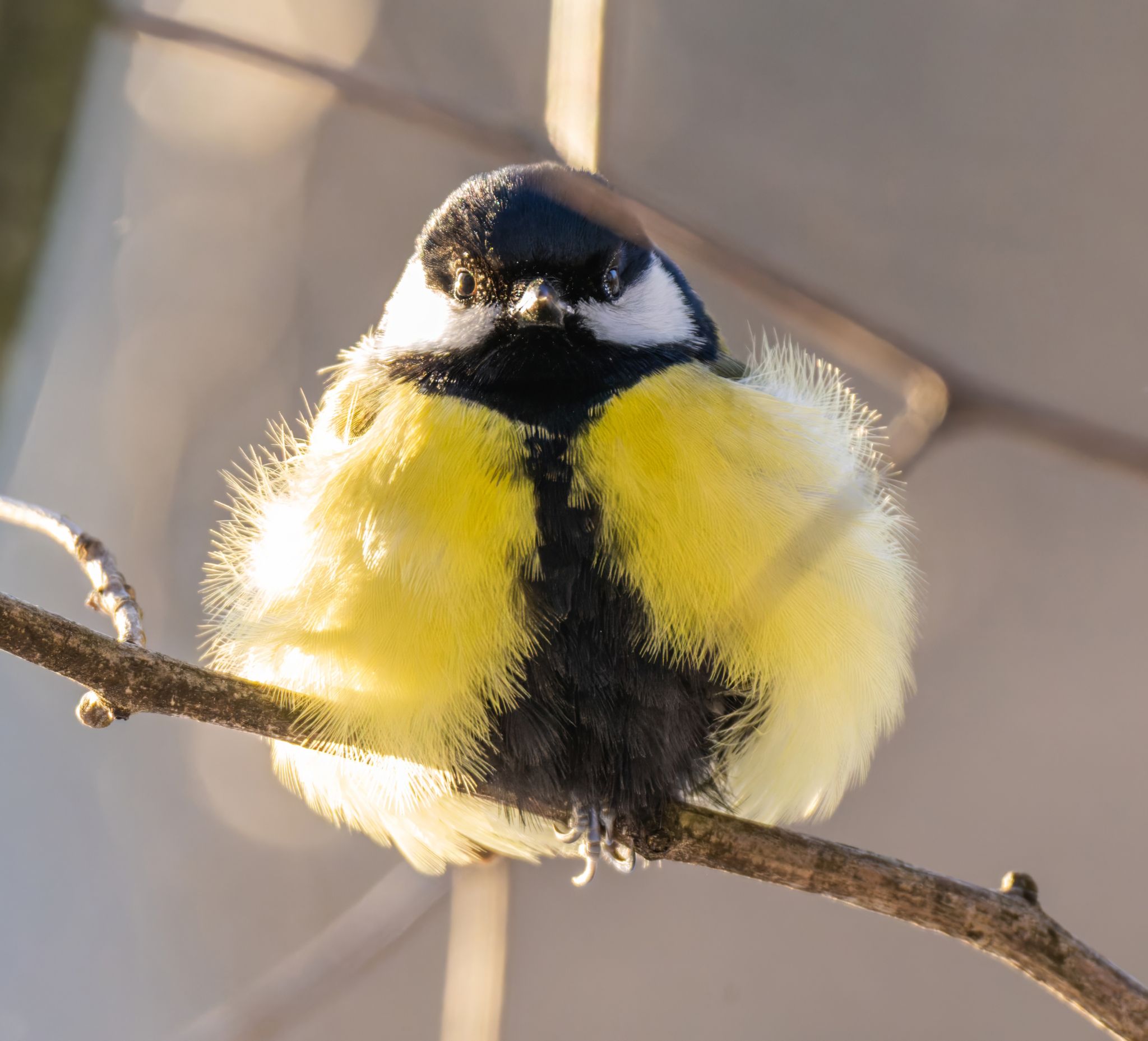 Насытившаяся синичка решила передохнуть и ловит последние лучики заходящего солнца. Распушилась не спроста. Таким образом она немного улучшает термозащиту для своего тела.
