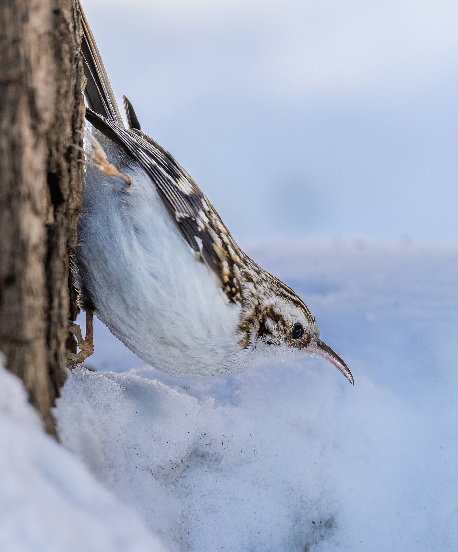 Птица в снегу — ловко прижавшись к стволу, словно замерла в движении. Контраст белого оперения и тёмной коры выделяет её, а длинный клюв, направленный вниз, создаёт ощущение сосредоточенности. 🐦❄️