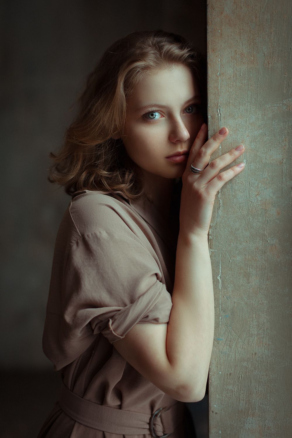 На снимке — Настя, запечатлённая в момент тишины. Её поза, прижавшаяся к стене, и пронзительный взгляд создают ощущение внутреннего напряжения и уязвимости. Фотограф Денис Котов мастерски использует контраст света и тени, подчёркивая текстуру кожи и ткани. Платье в нейтральных тонах гармонично вписывается в атмосферу сдержанности и глубины. Изображение — это не просто портрет, а рассказ о внутреннем мире.