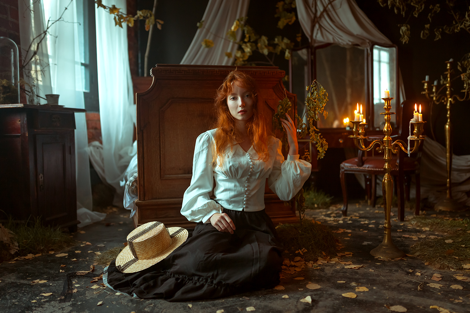 Классная атмосфера, Денис. Свет, как в старых пьесах — мягкий, но с характером. Алина сидит так, будто не знает, что её снимают, и это чувствуется. Детали — свечи, соломенная шляпка, листья на полу — не перегружают, а дополняют. Всё выглядит естественно, хотя, конечно, это студийная работа. Хорошо сбалансировано. 👏