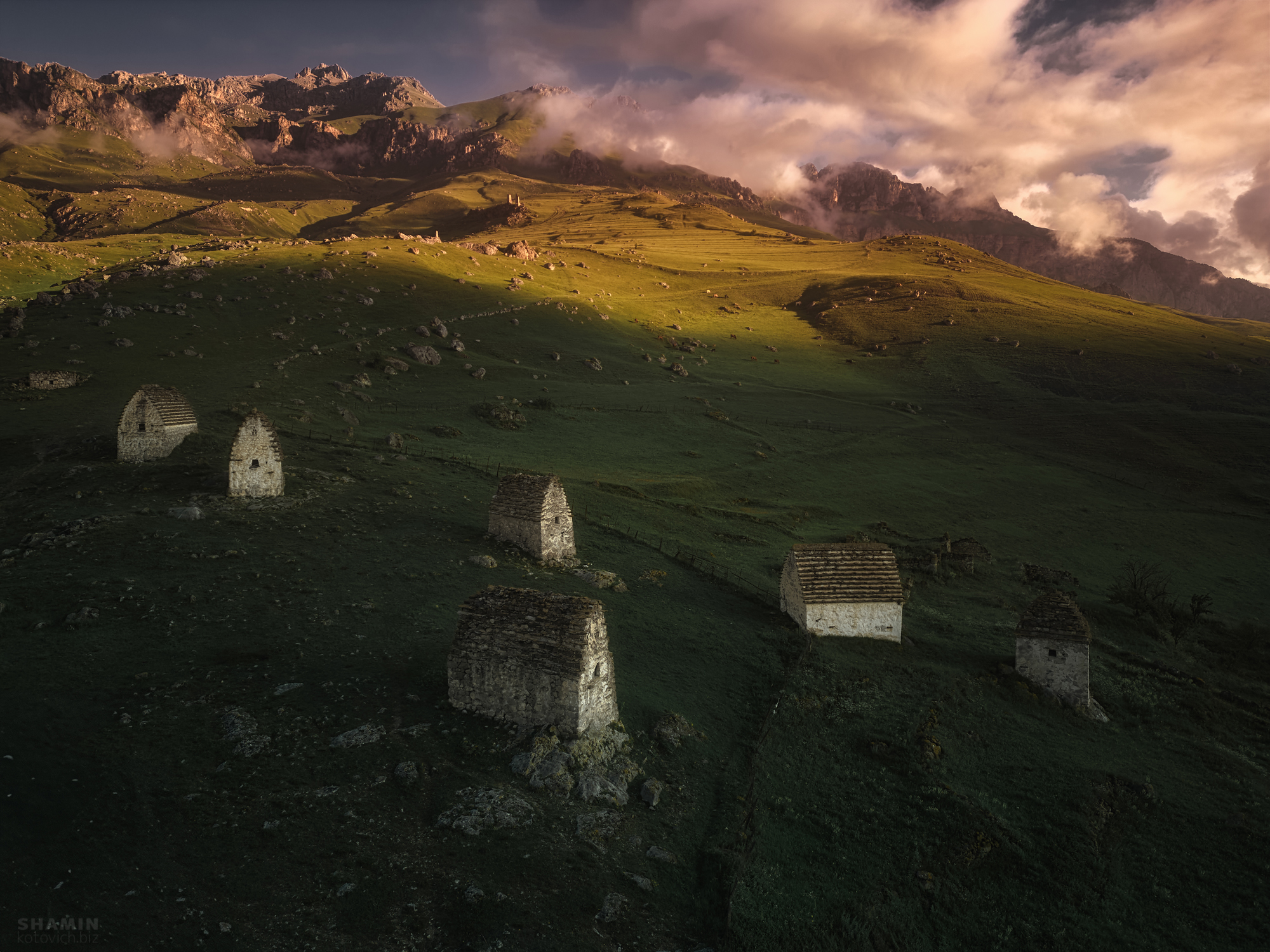 На фоне величественных гор, окутанных облаками, солнечные лучи пронзают туман, освещая руины старых домов, утопающих в зелени. Это место, где время замерло — пустые стены, как памятники ушедшей жизни, стоят в тишине. Каждый камень хранит историю, а свет заката придаёт сцене почти мистическое величие. Фотограф Константин Шамин запечатлел этот миг — где природа вновь возвращается к себе, а человек остаётся лишь в памяти.
