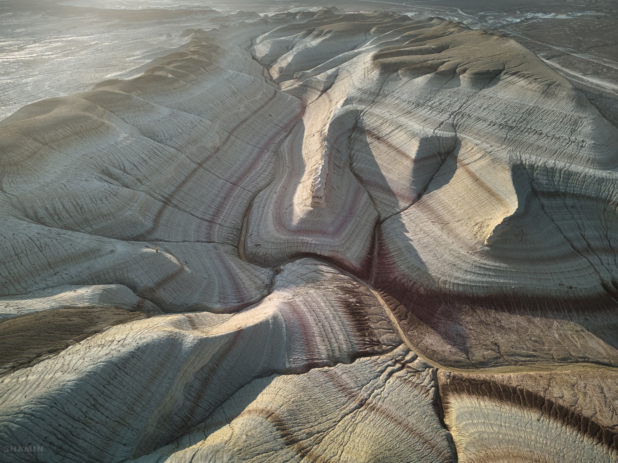 На снимке запечатлены сложные формы выветривания горных пород, образовавшиеся за миллионы лет. Слои разного цвета и плотности создают визуальную динамику, подчеркнутую игрой света и тени. Камень, словно живой, изгибается и раскалывается, раскрывая историю земли. Фотография передает масштаб и красоту природных процессов, застывших в моменте. Константин Шамин запечатлел эту сцену с высоты, подчеркивая абстрактную геометрию природы.