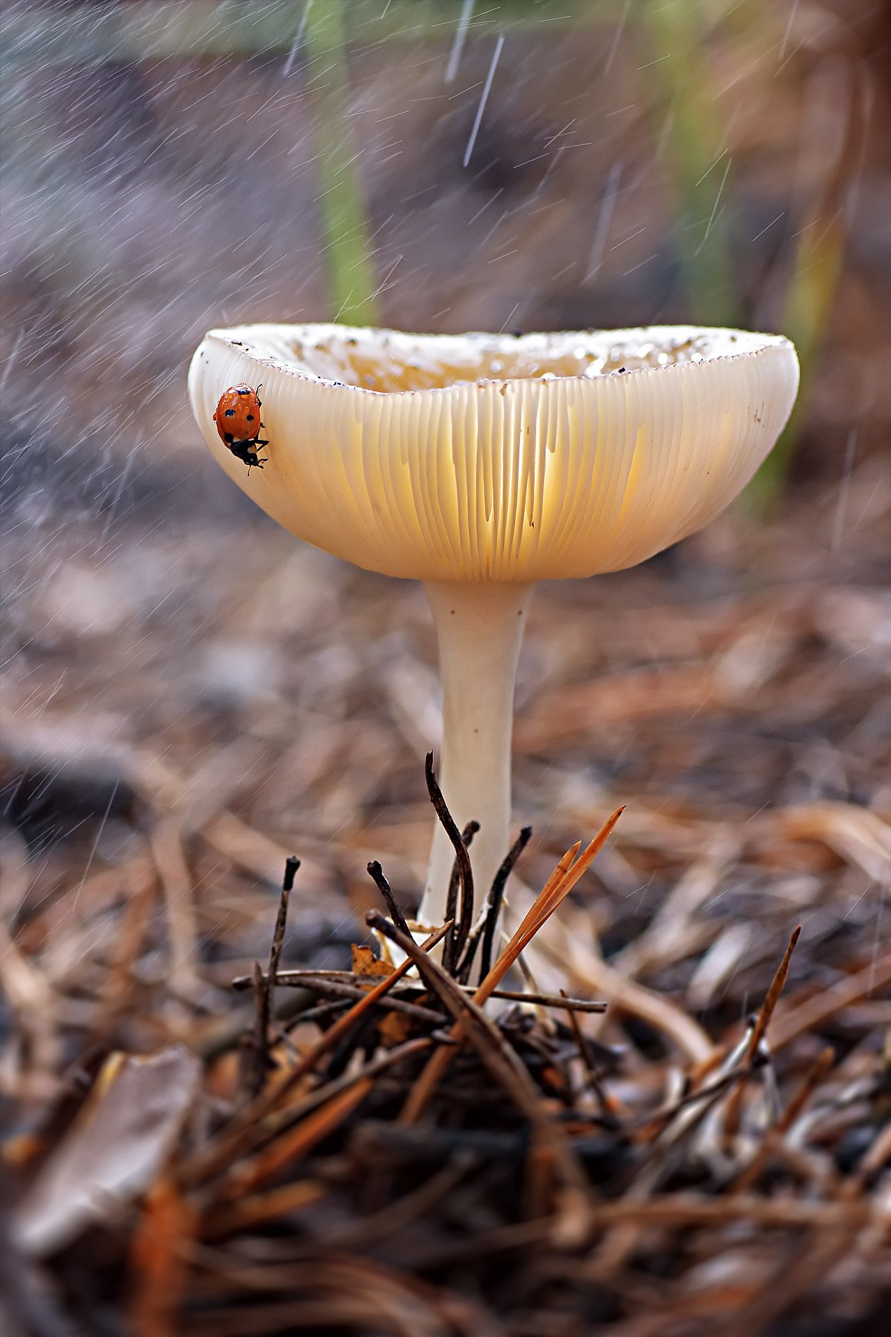 гриб,жук,вода,дождь,хвоя,красный,свет,лес, Юрий Котов