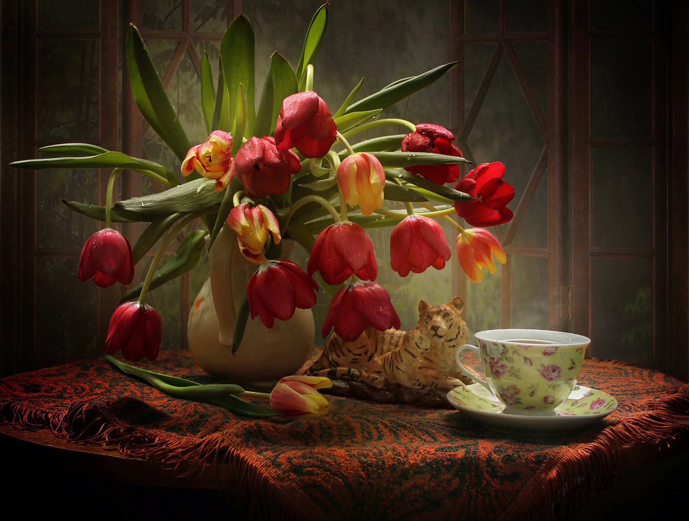 натюрморт, цветы, тюльпаны, чай, статуэтка, тигр, Ковалева Светлана
