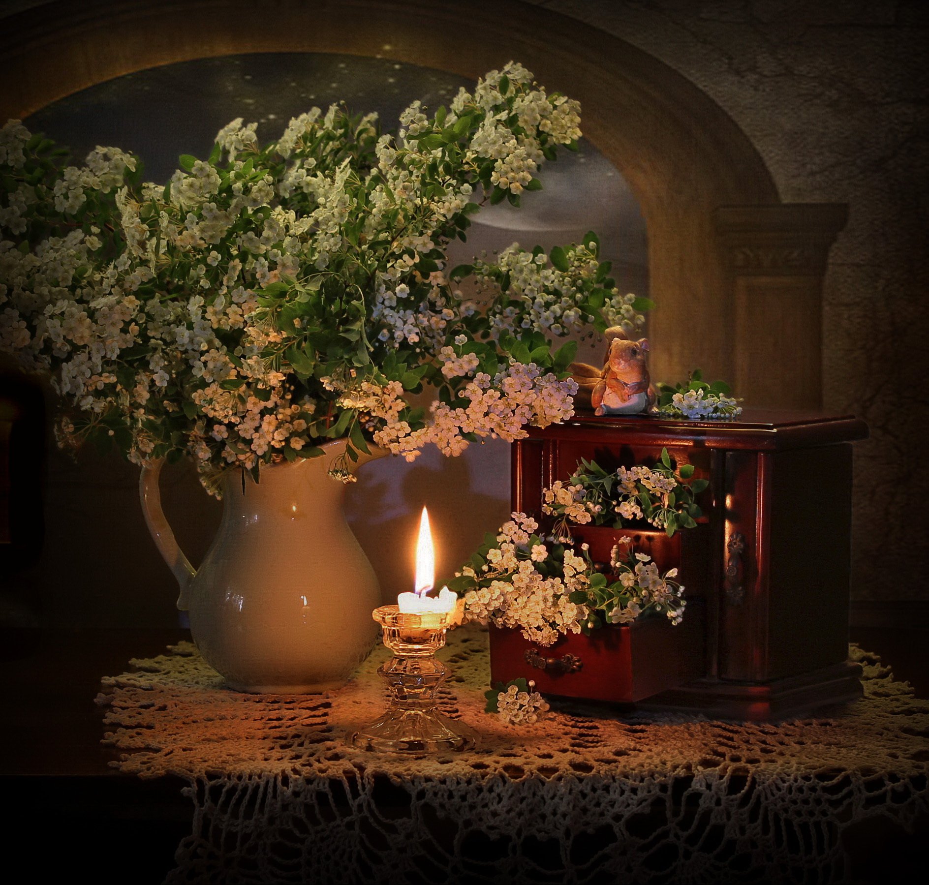 натюрморт, весна, цветы, спирея, белка, керамика, Ковалева Светлана