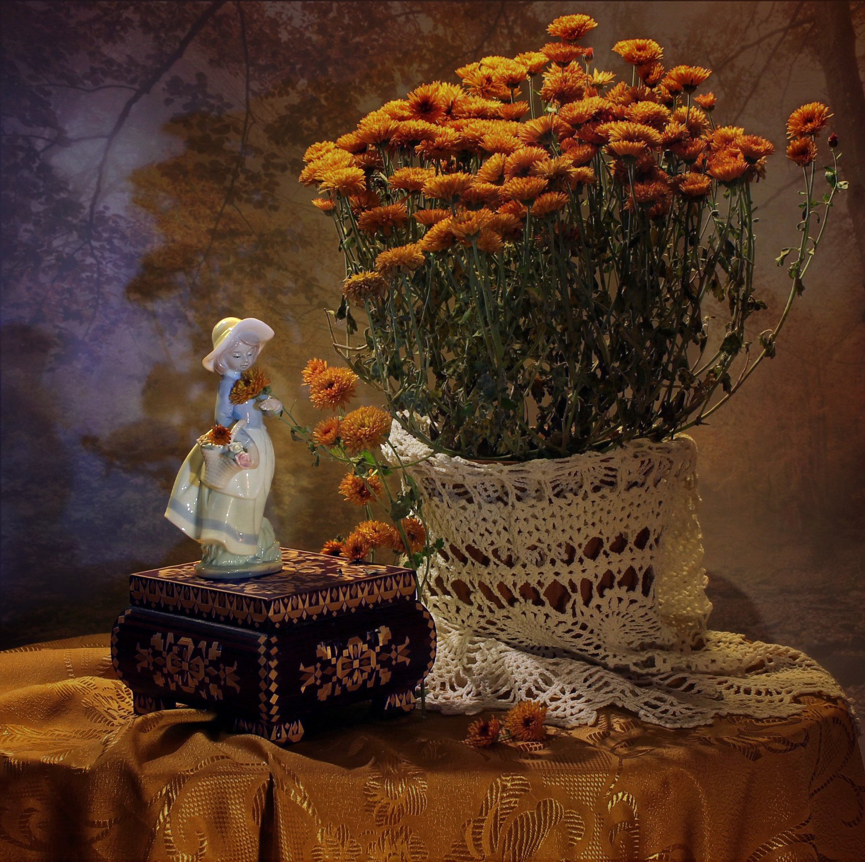натюрморт, осень, хризантемы, статуэтка, девушка, цветы, Ковалева Светлана