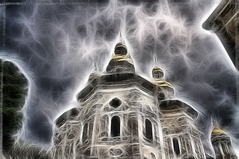 Попробуйте слоями. Создайте второй слой, на который повесите этот плагин, далее прозрачность слоя делаете такую, чтобы за эффектом не терялся сам храм, ну и думаю там где кресты немного протереть ластиком, что бы все таки было видно. Это всё только как вариант.