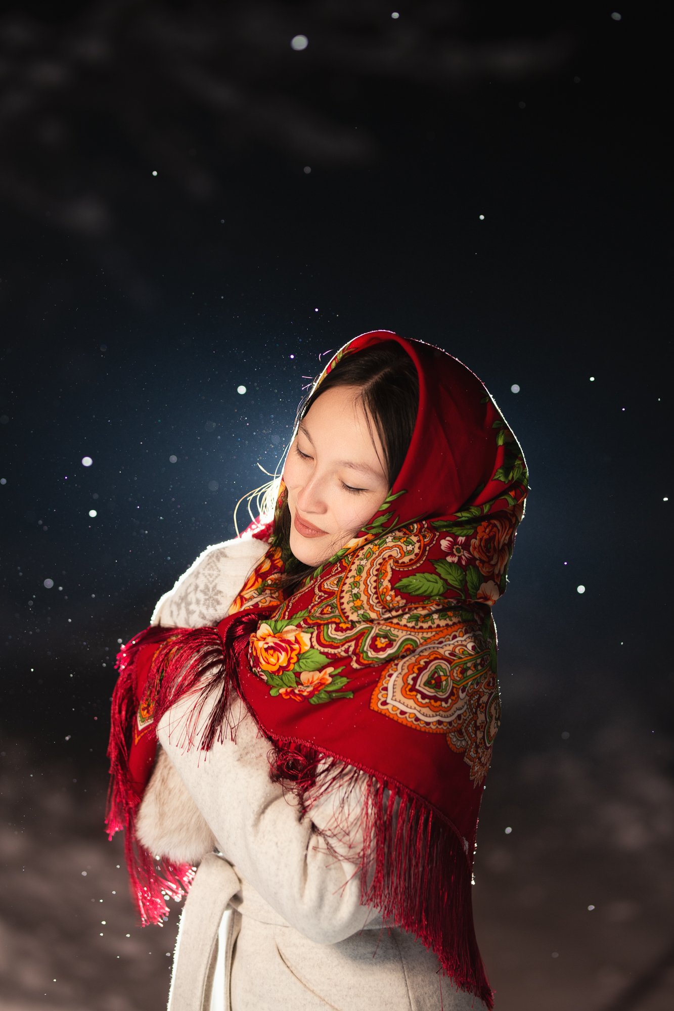девушка, портрет, зима, платок, фото , контровой свет, вспышка, фото со вспышкой, снег, матрёшка, боярыня, старорусский стиль, женщина,, Кристина Дугина