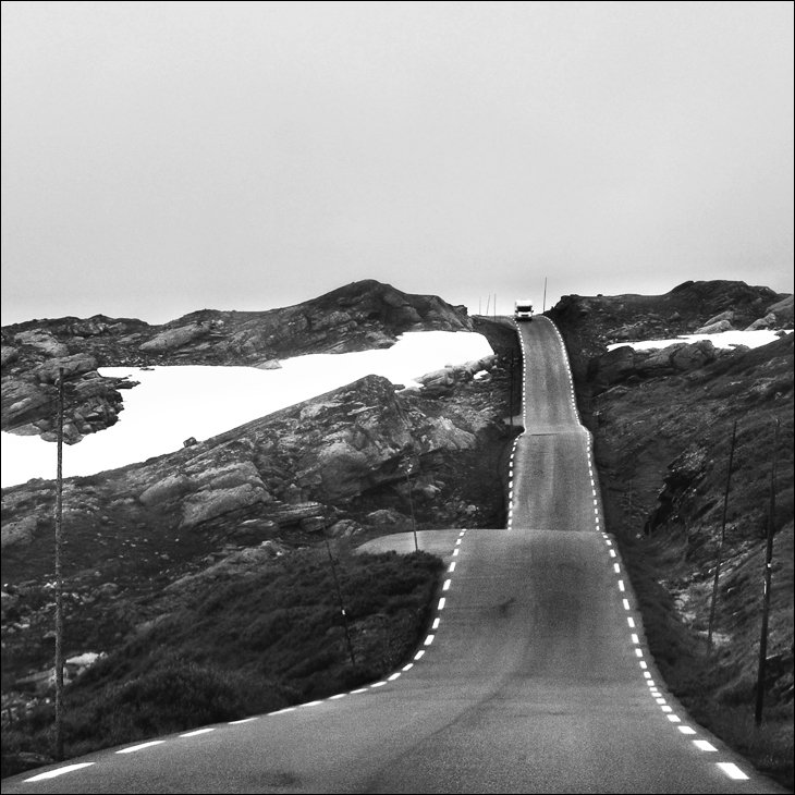 А какие там суперские виды в хорошую погоду! Это трасса 55 в Норвегии. Там вокруг горы - самые высокие в Скандинавии ;) В мае 2009 мы там на Галдхопиген ходили, а в июле 2011 (этот снимок как раз тогдашний) с погодой нам жутко не повезло - сплошной туман, сырость и низкая облачность. И вот на великах некоторые любители прутся там по сырости и туману... бр :)