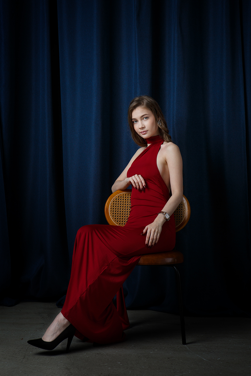Ирина сидит в красном платье на деревянном стуле перед тёмно-синим занавесом — сдержанно, но выразительно. 🎭