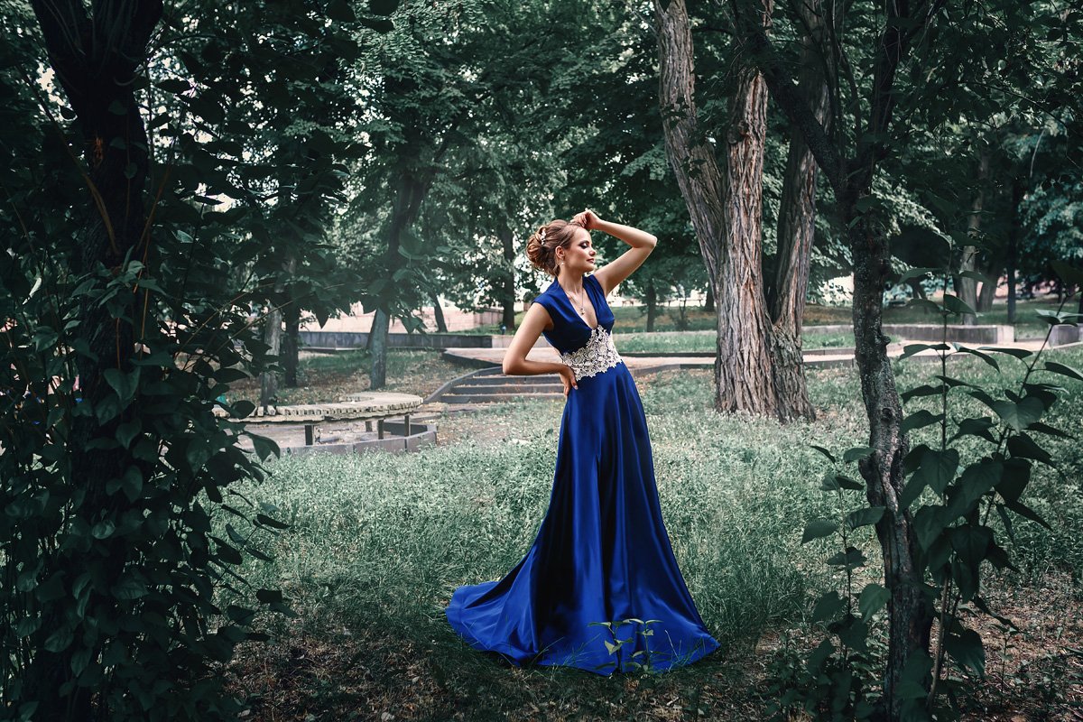 мода, платье, красивая девушка, прическа, макияж, синий и зеленый, теплый и холодный, блондинка, парк, город, цвет, лето, деревья, Марина Кондратова