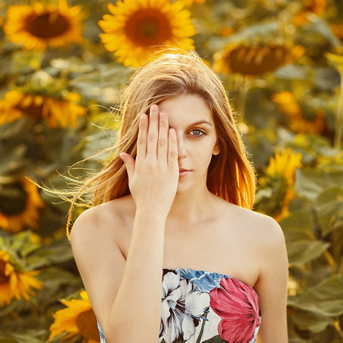 девушка, солнце, лето, подсолнухи, настроение, свет, яркий, желтый, цвет, руки, глаза, взгляд, крупный план, Марина Кондратова