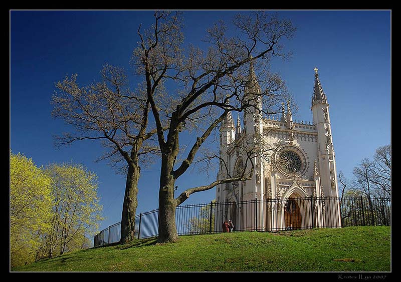 Это Готическая капелла(старое название Церковь св. Александра Невского) находится в Петергофе в парке Александрия. это домашняя церковь царской семьи, построенная специально для Александры Фёдоровны по проекту ар-ора Шинкеля(1831-1833годы)