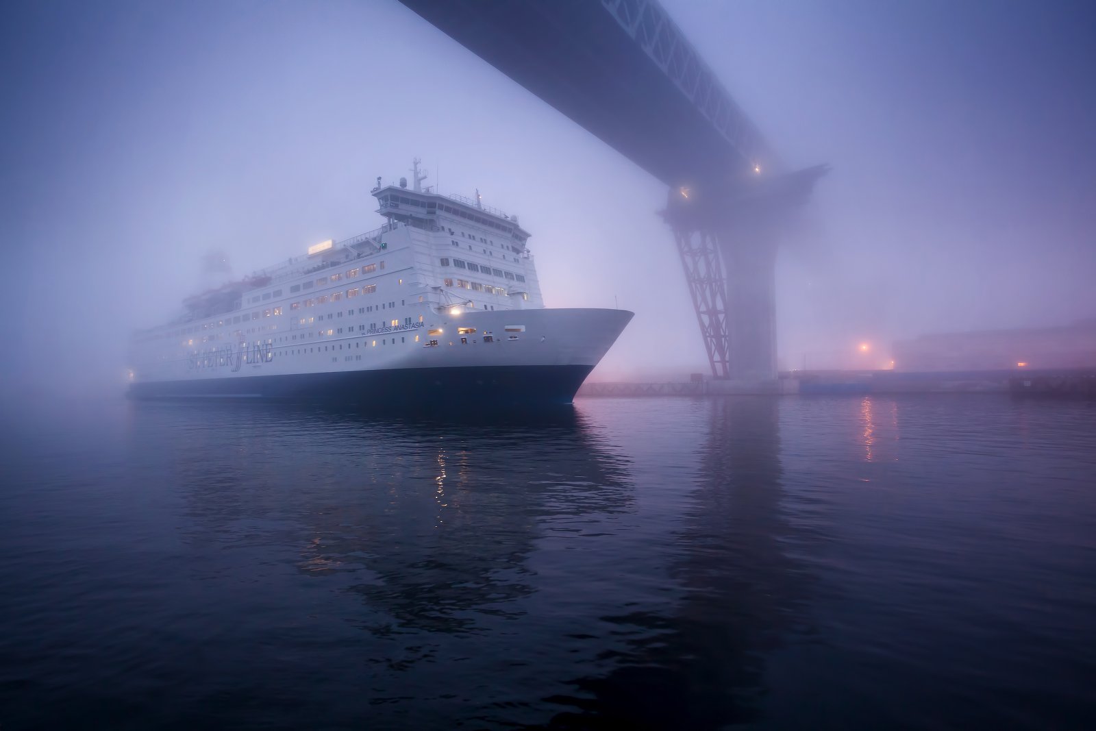Ехали фотографировать закат, но как это часто бывает в Питере погода поменялась кардинально за 10-15 минут. Небо заволокло тучами, на город опустился туман... И получилось даже лучше, чем мы ожидали! Как раз, как только мы достали фотоаппарат и штатив и начали делать тестовые снимки, из тумана медленно появился этот белоснежный огромный лайнер. Тут мы поняли, что нам очень повезло! :)