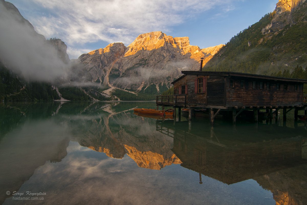 Альпы, Брайес, Горы, Доломиты, Лодки, Озеро, Отражение, Причал, Рассвет, Туман, Haidamac