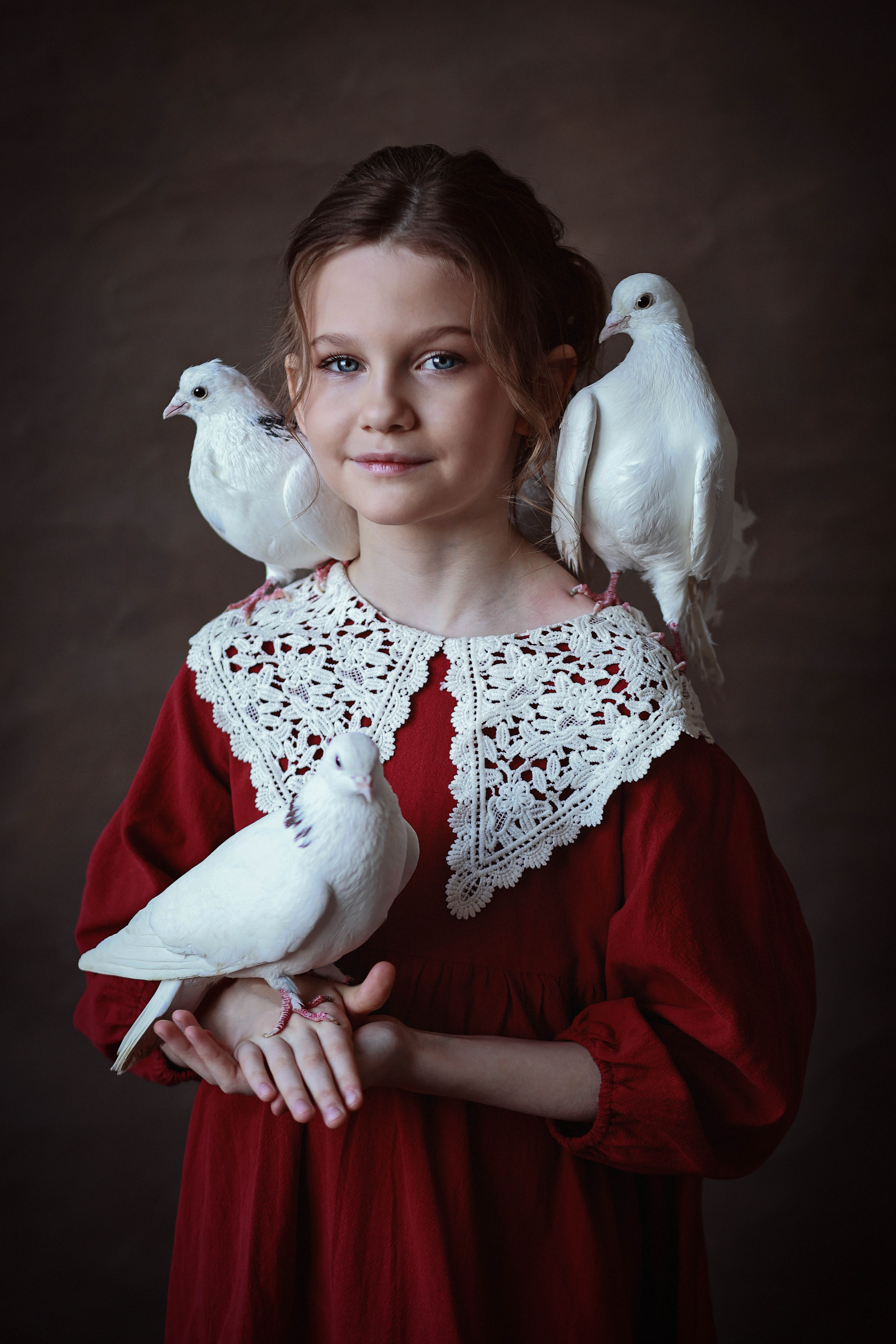 Аксинья, работа выверенная, но без лишнего пафоса. Птицы в кадре — удачный ход, хотя композиция могла бы быть плотнее. Цвета сбалансированы, свет мягкий. Хорошая основа для портрета.