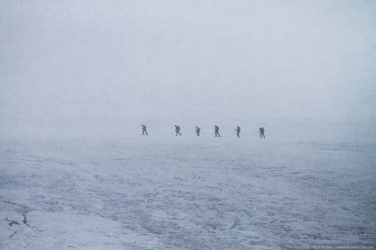 Альпинисты в связке проходят зону трещин (одна из самых неприятных зон восхождение, кругом трещины глубина которых может достигать 100 метров). гора Эльбрус.