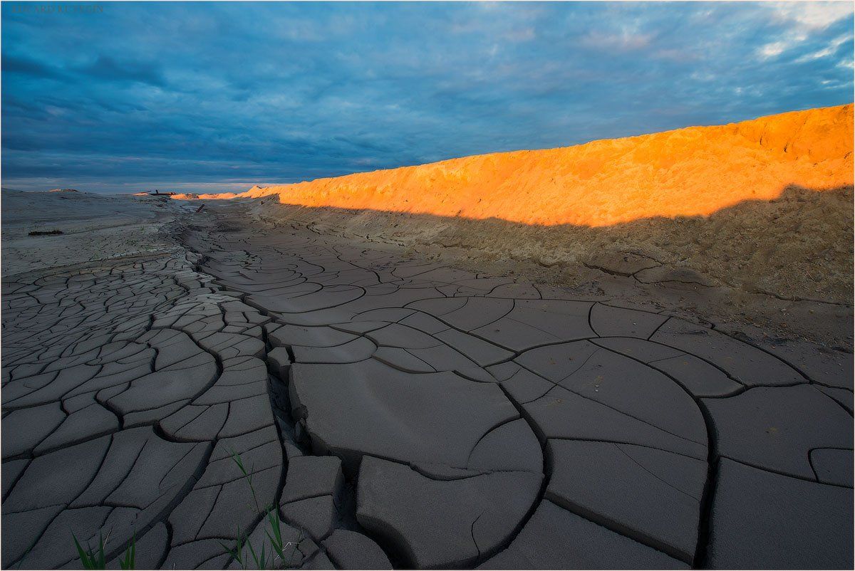 Южный Урал, Челябинская область, шламохранилище графитового завода или "пустыня" в п. Тайгинка, большое хранилище песка, являющегося отходом при производстве графита. Создано подобие "кратера" со стенками из песка, песок подаётся с водой по трубам в разные части этого кратера. Уровень дна картера метров на 15 выше уровня окрестных озер, а высота стенок 7-10 метров выше уровня дня хранилища. Место необычное. Освещение в разное время дня то дает идеалистические картинки с белым песком, то апокалиптические сюжеты экологической катастрофы. Необычно выглядят стены кратера снаружи, в тех местах где они засыпают подступающий к ним лес. Когда приехал на разведку было пасмурно, но перед самым закатом повезло, солнце вышло на 10 минут