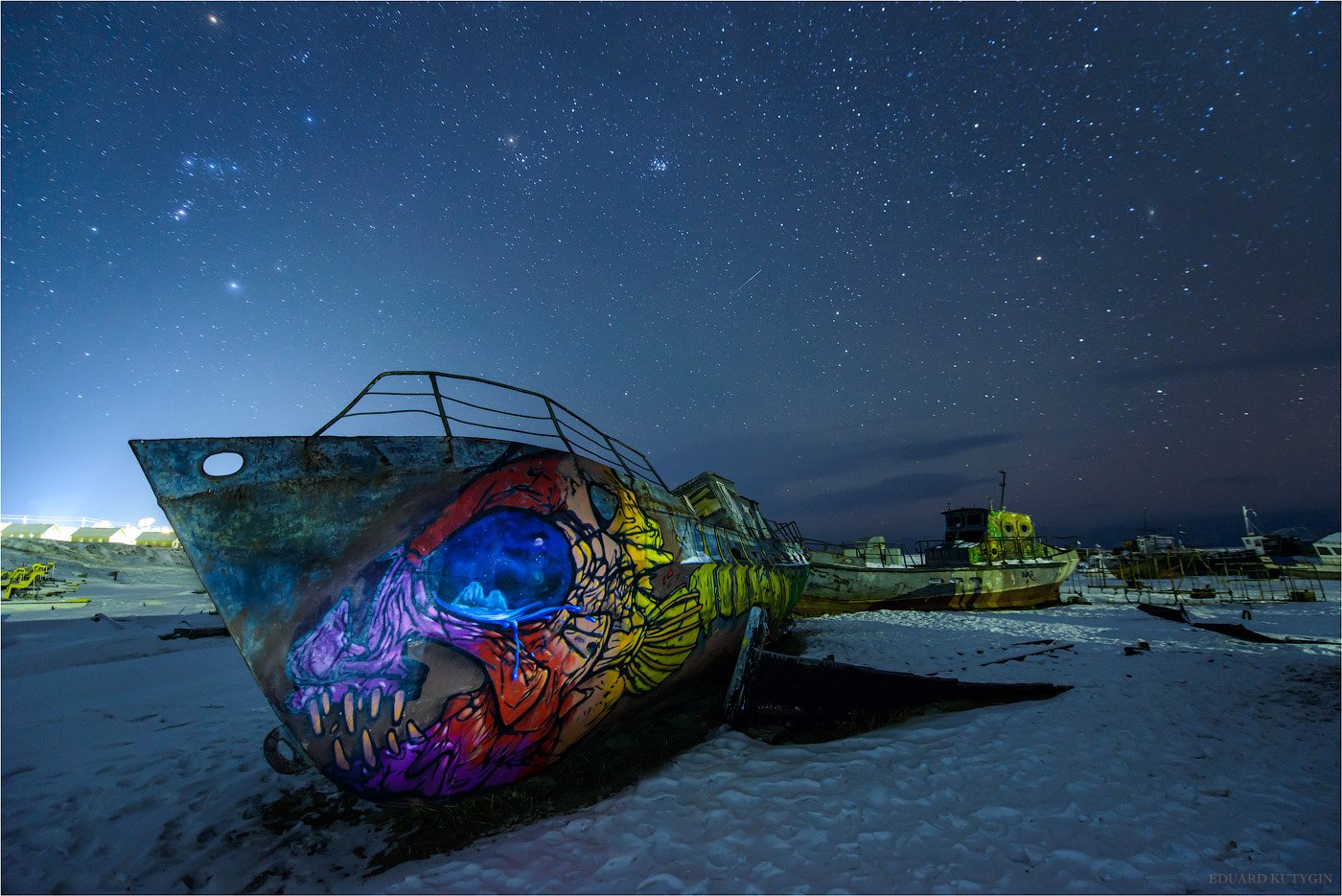 Поселок Хужир на острове Ольхон расположен очень удачно. Он примерно на равном удалении от основных достопримечательностей, там есть инфраструктура. Но помимо этого в нём самом есть несколько мест, которые стоит фотографировать. Конечно главный объект это скала Шаманка и её окрестности. Во вторую очередь я бы обратил внимание на пристань и корабли. В порту, хотя это громко сказано и всё же, можно увидеть 20 кораблей. Один самый большой, рыболовный траулер, он стоит у самой кромки воды и соответственно весь в красивых наплесках застывшего льда, есть чуть меньше десятка рабочих корабликов разной величины, и с десяток корабликов поставленных на прикол по причине выхода на пенсию. Эти кораблики особенно харизматичны, так как они раскрашены талантливыми граффити на морскую тематику. В ночной съемке этих объектов есть особенность, с одной стороны яркая подсветка от посёлка, что иногда плюс, а с другой эта подсветка создает засветку и не видно толком звёзд, особенно Млечный путь. Так же направление ракурса на Млечный путь затруднено расположением самих кораблей. Как бы то ни было это интересное место и там можно провести не одну фотосессию.