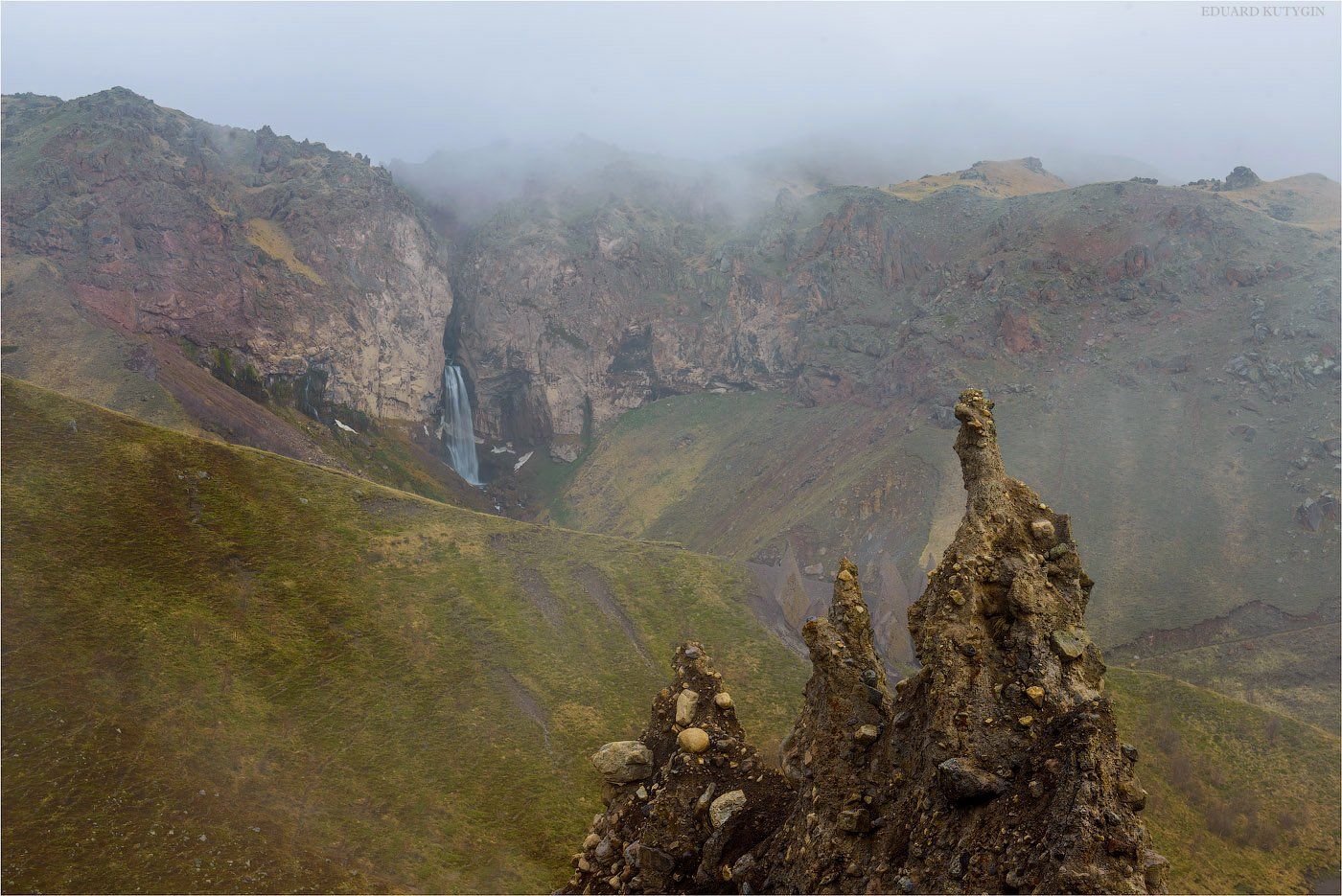 Кабардино-Балкария, северное Приэльбрусье, урочище Джилы суу. Низкие облака опустились на Эльбрус. Весь мир в тумане. Речка Малка образует очень красивый водопад Султан, на переднем плане останцы из местечка "Песчаные замки". 05.2018