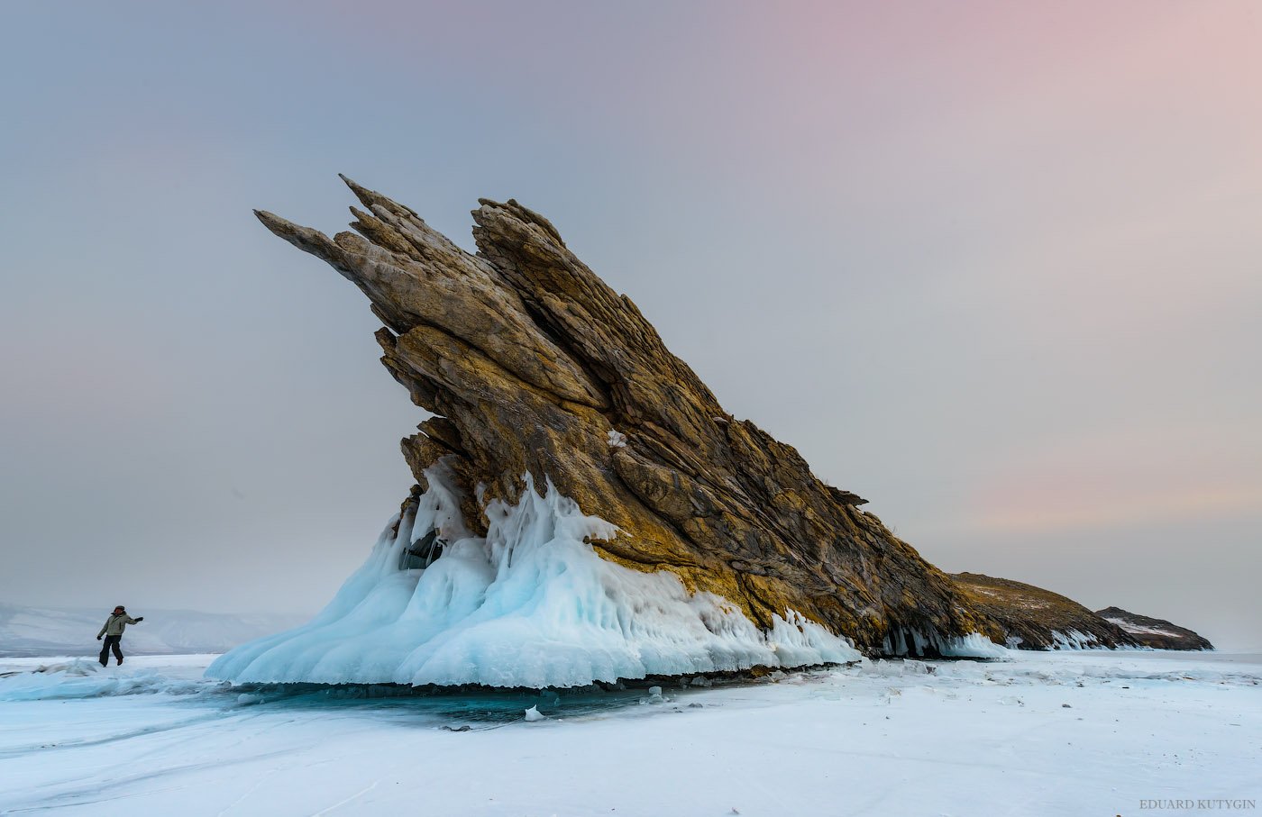 Встречу с юго-западным мысом острова Огой откладывали на потом, как вкусняшку, уж больно он замечательный, но когда наступил день поездки, всех кто был на Байкале в эти дни ждала большая засада. Сначала стало пасмурно это полбеды, а совсем плохо то, что пошел снег, пусть его было немного, но этого хватило с лихвой. Страшный враг и так немногочисленных открытых участков льда, которые ещё вчера были прозрачными, полированными, шлифованными, на небольших глубинах можно было увидеть камни, и даже рыбок. Теперь же всё стало равномерно белым. На подъезде увидели ещё автомобиль, идущий не с острова Ольхон, время дня и уверенный курс на известное место, выдавало то, что там едут тоже фотографы. Подъехали почти одновременно. Коллеги оказались более расторопными, быстро выгрузились, поставили штативы и достали то, о чём мы даже и не подумали, речь шла об автомобильных щетках-сметках. Несколько минут и у тебя появляется индивидуальный кусочек открытого льда. Опыт быстро переняли, правда, пришлось попросить щетку. Для иностранцев такой подход был открытием. Спасибо за щетку Андрею Ершову https://vk.com/id120020346 и его коллеге девушке Виктории. Но, увы, выразительность и освещение прекрасной скалы острова Огой подметание льда кардинально не решило, так только заняло часть времени. Но есть правило, работай с тем, что у тебя есть, и мы снимали.