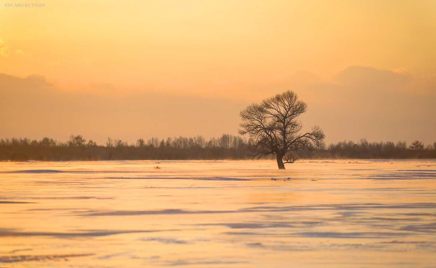 С заходом солнца мгновенно холодает с -12, до -20, и вода, вода оттаявшая за день, текущая тонким слоем поверх льда, начинает парить. Ландшафт и так нереальный из-за деревьев, растущих изо льда, становится волшебным.