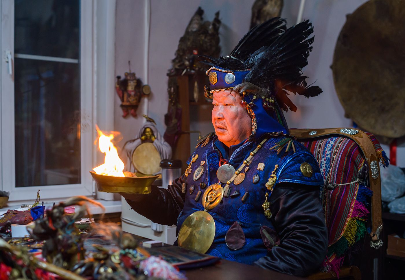 Верховный шаман Допчун-оол Кара-оол Тюлюшевич, при совершении обряда в своем кабинете. Республика Тыва, г. Кызыл. 03.2021