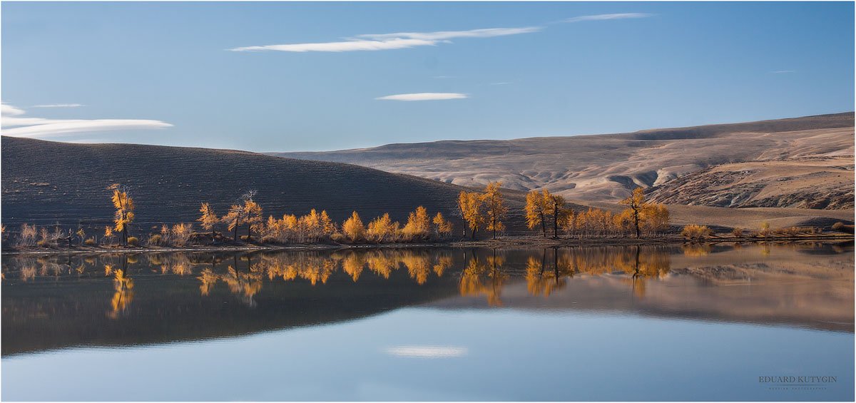 алтай, чуйская степь, красногорское, озеро, отражения,идилия, небо, прозрачность, осень, золотая осень, горы, ледник, снег, снежные вершины, скалы, поле, стерня, деревья, стадо, одинокая, одиночная, голубой, желтый, Кутыгин Эдуард