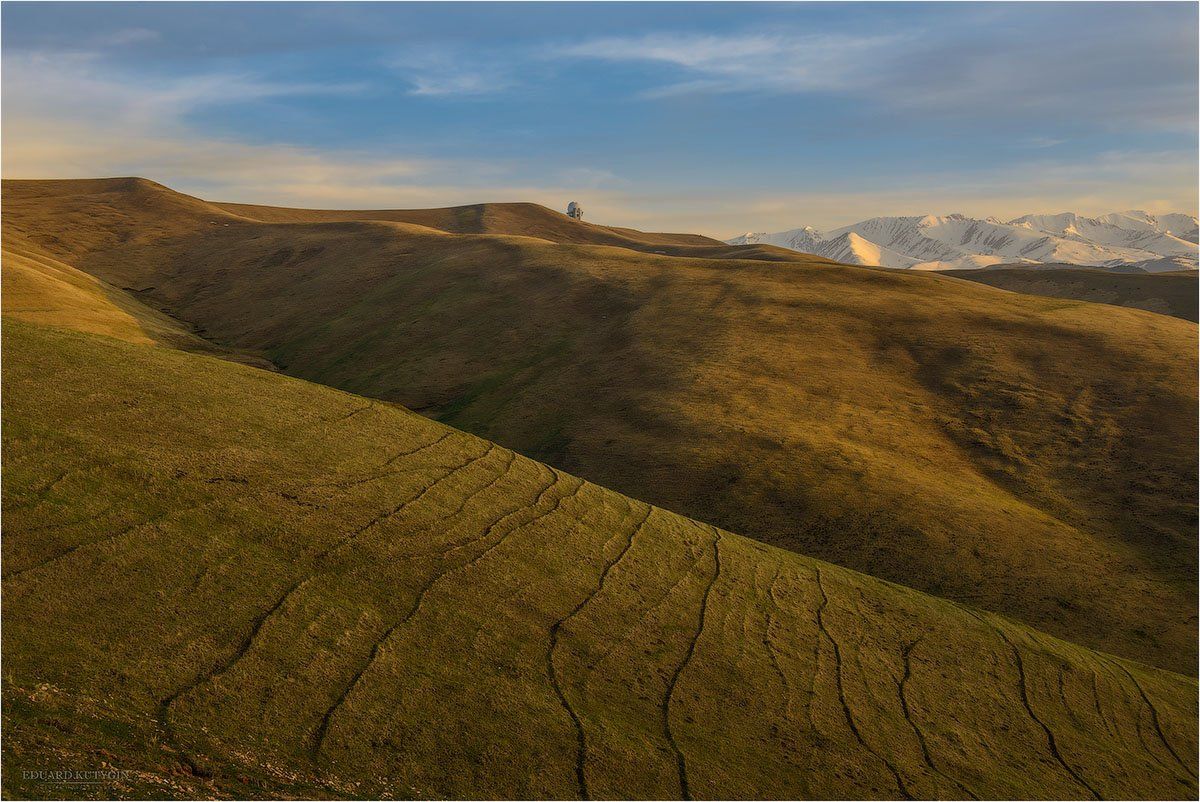 Плато Асы. Вид на юг, на обсерваторию. Ласковый закат. Плюшевые склоны. Снежные вершины.