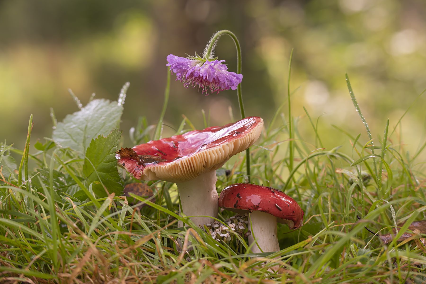 Как цветочек рассматривает сыроежку) Чудесное фото!