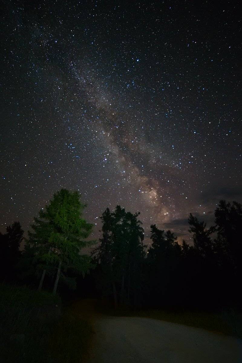 Четыре первые фото сделаны на Алтае, на Улаганском нагорье. Вообще съёмка планировалась другая, место было присмотрено на вершине высокого холма. Однако, придя туда в полночь и приготовившись к съёмке. я услышал неподалёку медвежий полувыдох-полурык. Быстро собрав шмотки я спустился вниз, на дорогу, где сделал пару снимков. Оттуда я тоже был с позором изгнан уже двумя рыками. Срочно вернувшись в лагерь, я разжёг огонь, надеясь, что мишка не захочет погреться. Тут мой взгляд упал на куски свежей баранины, вывешенные на дереве, чтобы в машине не прели. Оставалось догадываться, сильно ли миша любит баранину.... Спать не хотелось.... Моя палатка стояла в стороне от всех...Попив чаю я сделал ещё два снимка и лёг спать, только когда небо стало синеть.