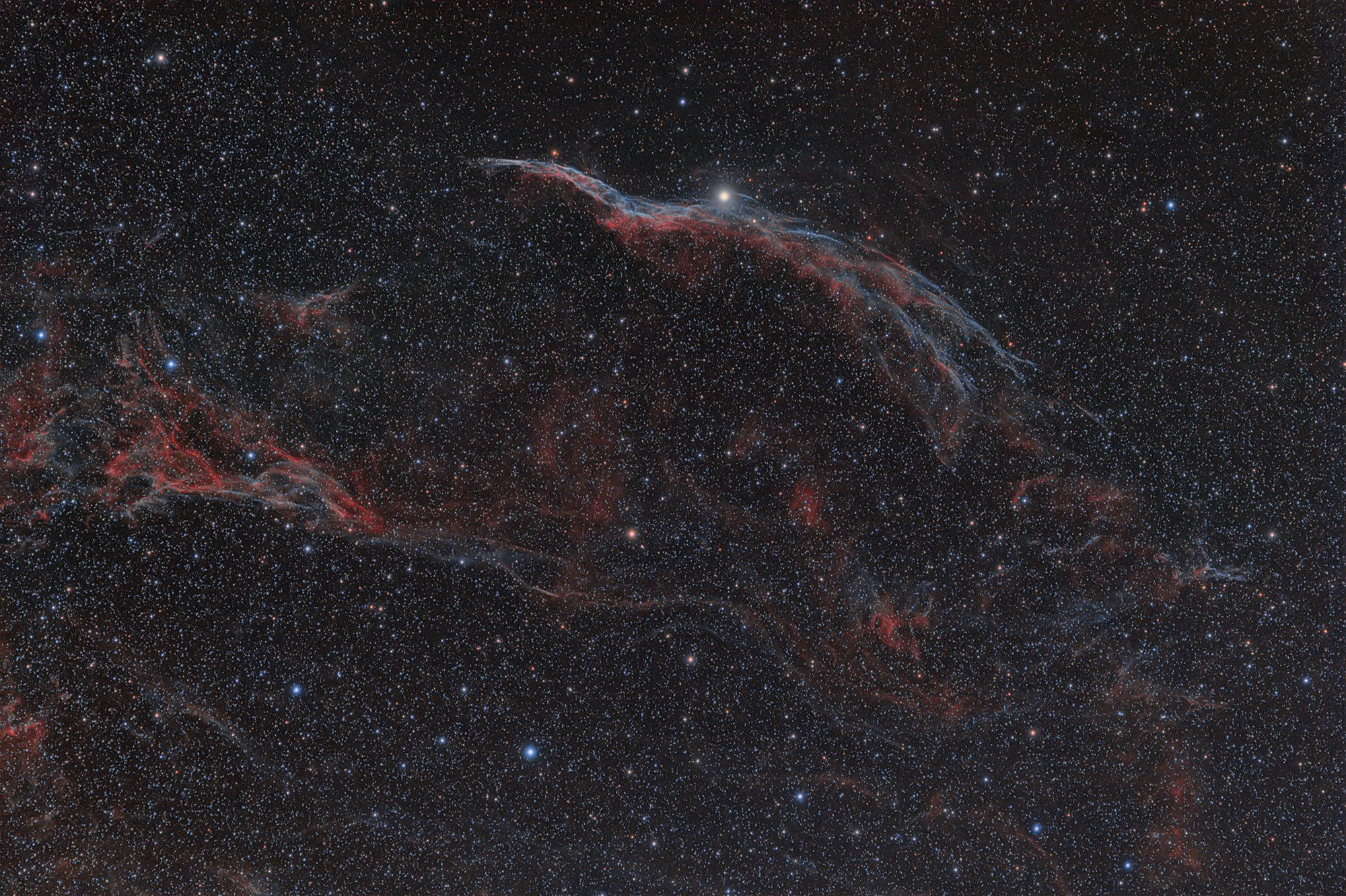 Десять тысяч лет назад, ещё до рождения известной истории человечества, на ночном небе Земли появилась новая яркая звезда, которая постепенно ослабела и исчезла через несколько недель. Сегодня мы знаем, что это был свет взрыва сверхновой звезды, а её обломки — это остаток сверхновой, записанный в каталоге под именем туманности Вуаль, однако известно неформальное имя этого облака — туманность Ведьмина метла. Ударная волна, вылетевшая из катастрофического взрыва, плывёт сквозь космос, сгребая и возбуждая межзвёздное вещество.